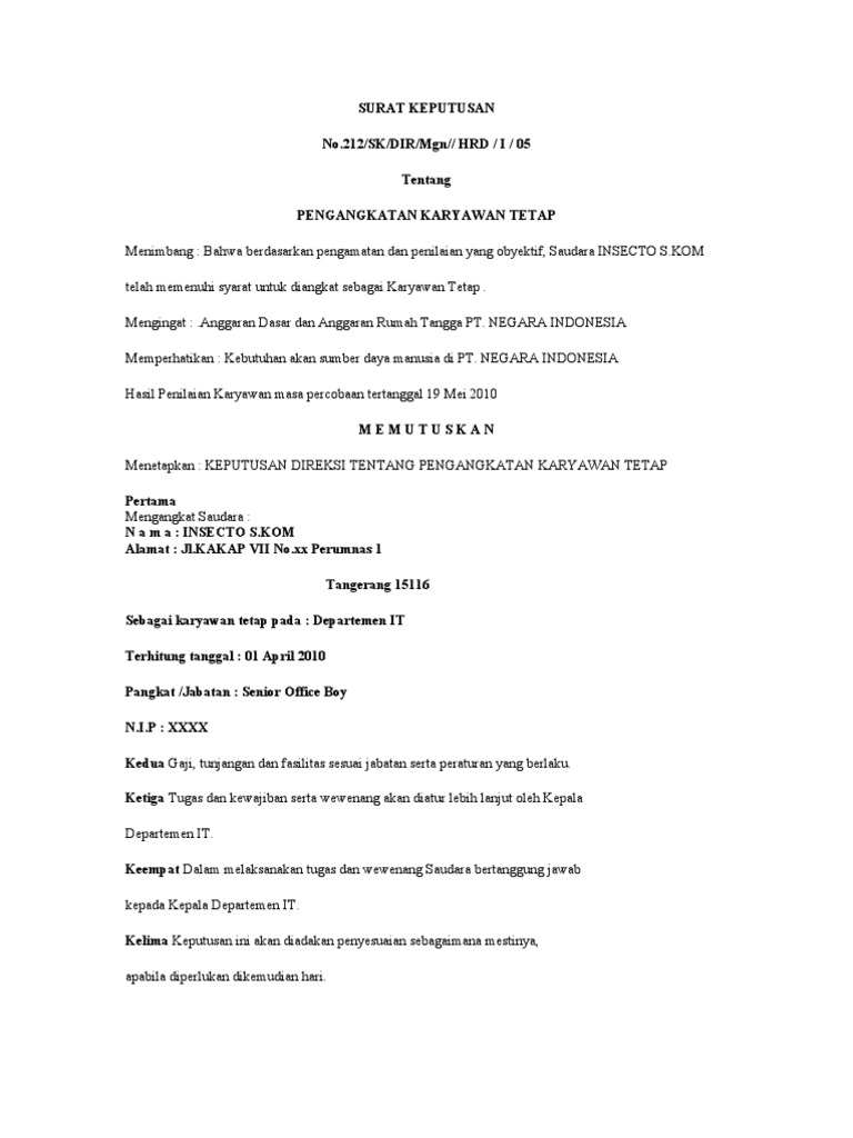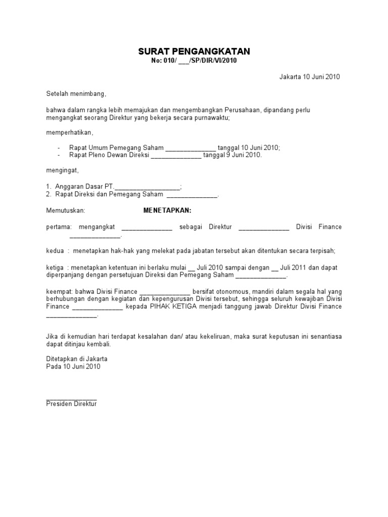 Contoh surat keputusan pengangkatan departemen. Jika misalnya anda tidak membuat surat tersebut, maka meskipun nantinya anda bisa keluar. Dalam sebuah instansi, lembaga, atau pun perusahaan untuk legalitas yang berkekuatan dalam pengangkatan seorang karyawan untuk posisi atau jabatan tertentu, maka instansi, lembaga atau perusahaan membuat surat keputusan tertulis. Kepala badan pusat statistik dan. Surat keputusan adalah temasuk pada surat legal atau resmi, dan surat keputusan yang paling populer adalah surat keputusan pengangkatan jabatan atau yang surat keputusan. Contohnya surat peputusan mutasi pegawai, surat keputusun pengangkatan jabatan. Contoh surat keputusan pengangkatan direktur. Contoh surat pengangkatan jabatan karyawan swasta, contoh surat keputusan pengangkatan jabatan, contoh surat keputusan perusahaan contoh surat pengunduran diri dari jabatan kepala sekolah sumber : Demikian surat keputusan jabatan ini di buat untuk saudara pergunakan dengan sebaik mungkin dan semestinya. Jabatan sebagai direktur merupakan jabatan yang sangat vital dan penting bagi sebuah. Pos pelayanan terpadu simbar jaya 3 dusun krajan, desa kaliurip, kecamatan madukara, kabupaten banjarnegara. Peraturan desa makmur jaya nomor x tahun yyyy tentang pengangkatan. By al lilah nur hasanah updated: